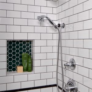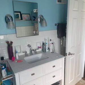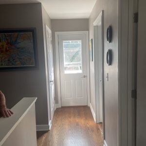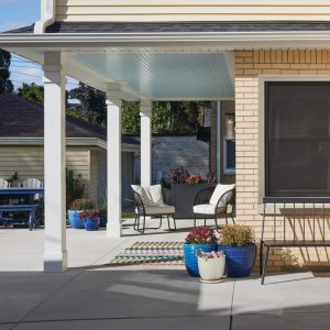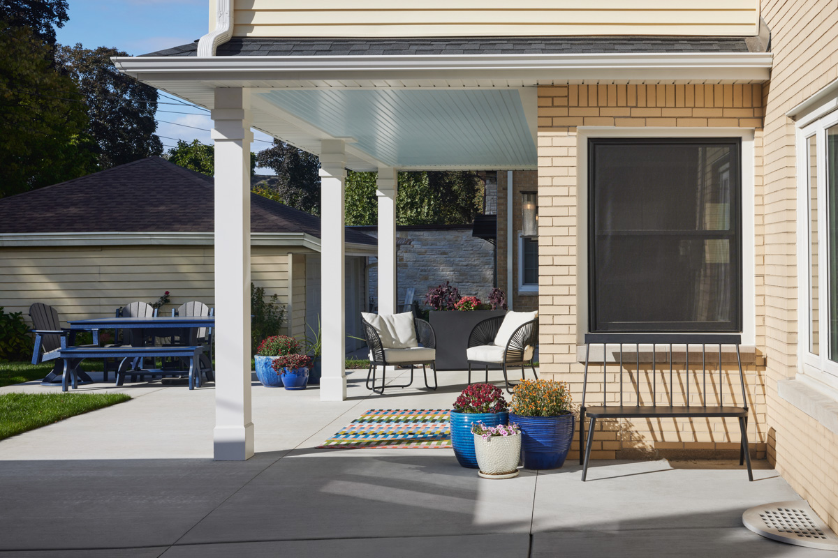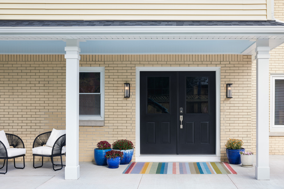Throughout the home, new windows, doors, and thoughtful spatial reconfiguration improved both flow and functionality for this busy family. Outside, the refreshed façade features updated windows and doors, along with a subtle Southern nod: a soft haint-blue ceiling above the front stoop and back patio, a timeless detail traditionally used to deter bees from nesting.
