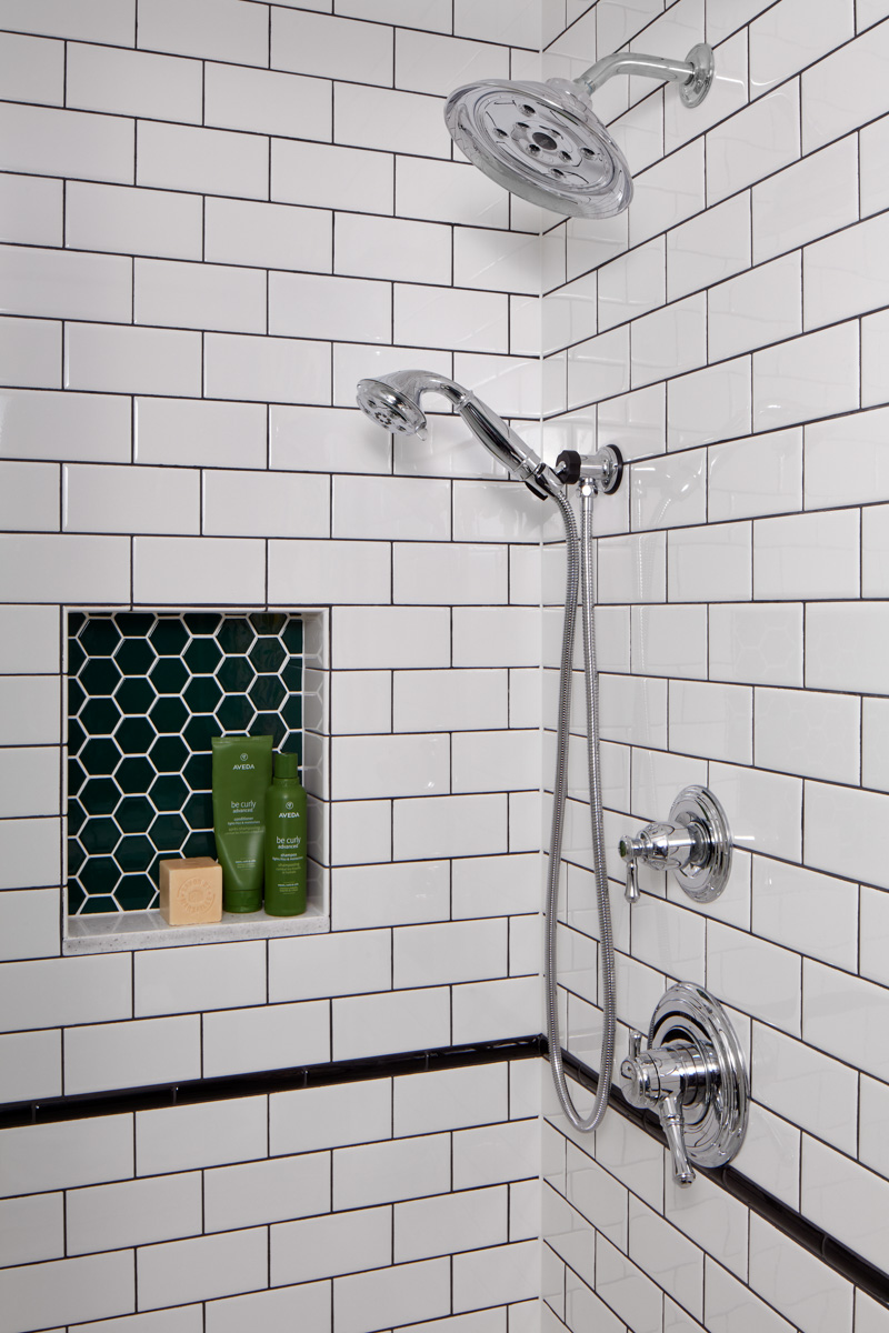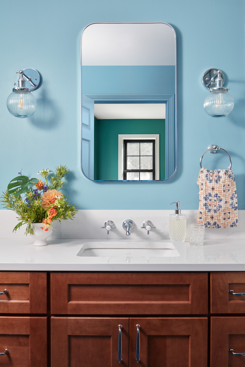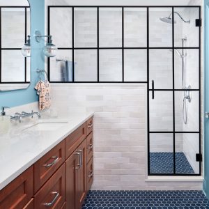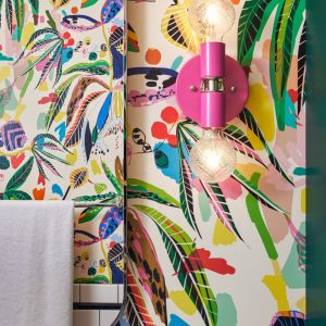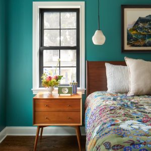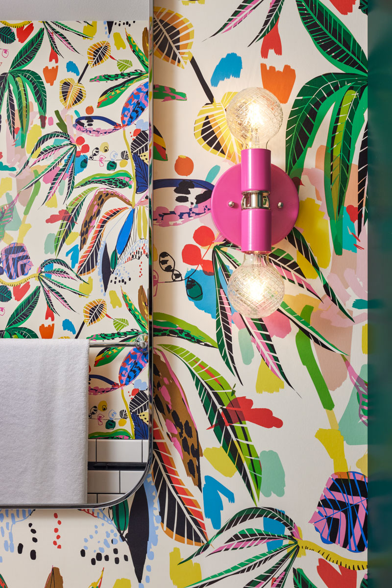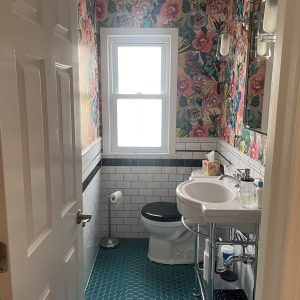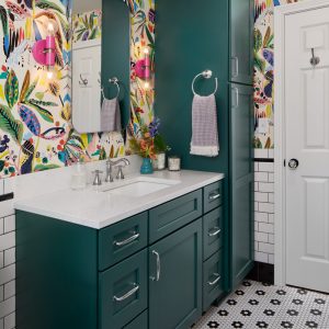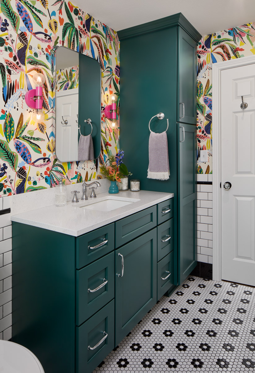 The addition transformed the entire upper level, creating a new primary suite anchored by four expansive windows, statement light pendants framing the bed, and a generous walk-in closet. The primary bathroom layers soothing shades of blue with a playful wallpapered toilet niche that adds a burst of color and charm. Down the hall, the kids’ bathroom embraces bold hues and whimsical wallpaper, turning daily routines into moments of delight.
