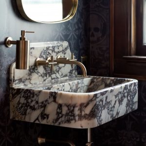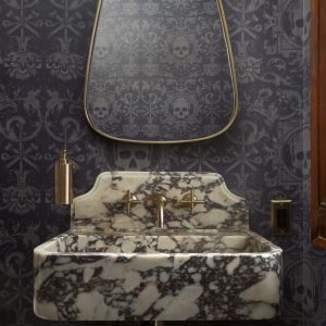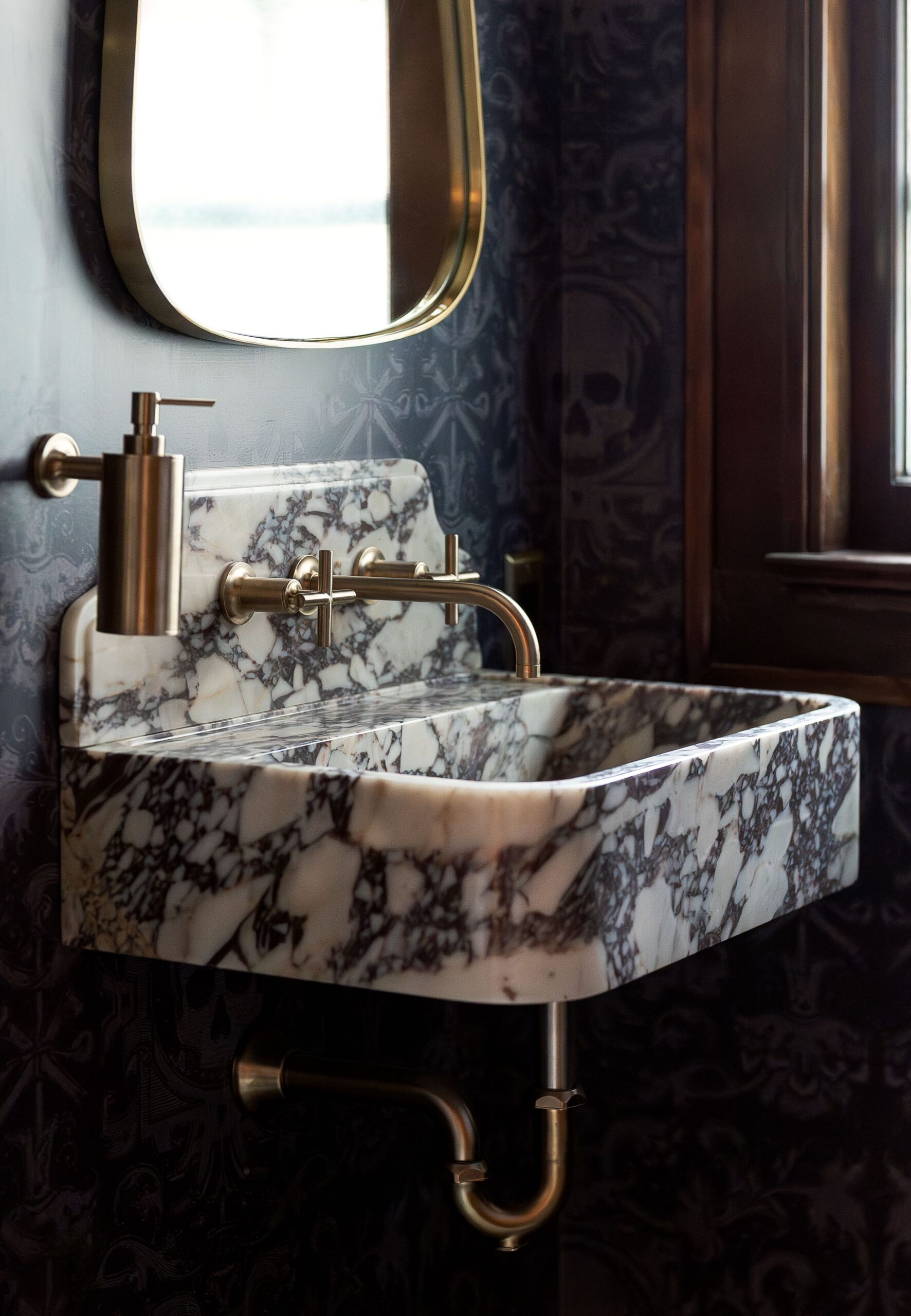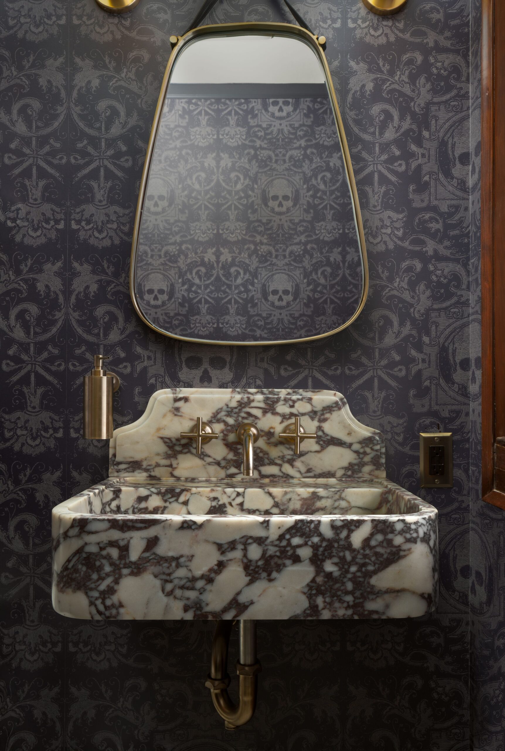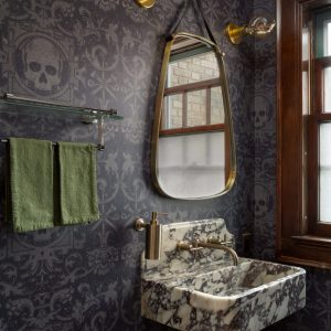 In this first-floor half powder room, the homeowners’ “punk rock” vision comes fully to life through richly layered details. Deep, inky wallpaper patterned with subtle skull motifs creates a moody backdrop that feels rebellious yet refined, while unmistakably adding more of a contemporary attitude to this home. Anchoring the space is a sculptural marble sink, its bold veining and substantial form giving the room a sense of permanence and craft, almost like a vintage artifact rediscovered rather than a new addition. Warm brass light fixtures and plumbing accents add contrast and polish, casting a soft glow that elevates the darker palette and balances the edge of the wallpaper with classic elegance. The result is a small but unforgettable bathroom that confidently blends irreverence, luxury, and respect for a 1922 Milwaukee home.