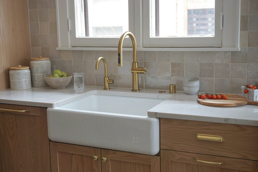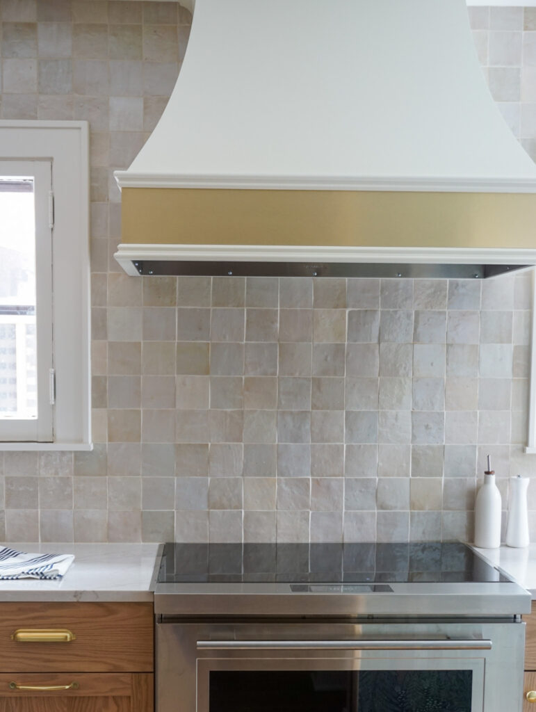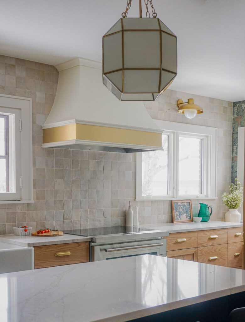 Material selections balance durability with texture. Quartz countertops provide a clean, resilient work surface, while the backsplash introduces subtle variation through a hand-crafted zellige tile in a straight stack pattern. Together, these elements keep the space feeling refined without becoming overly formal.