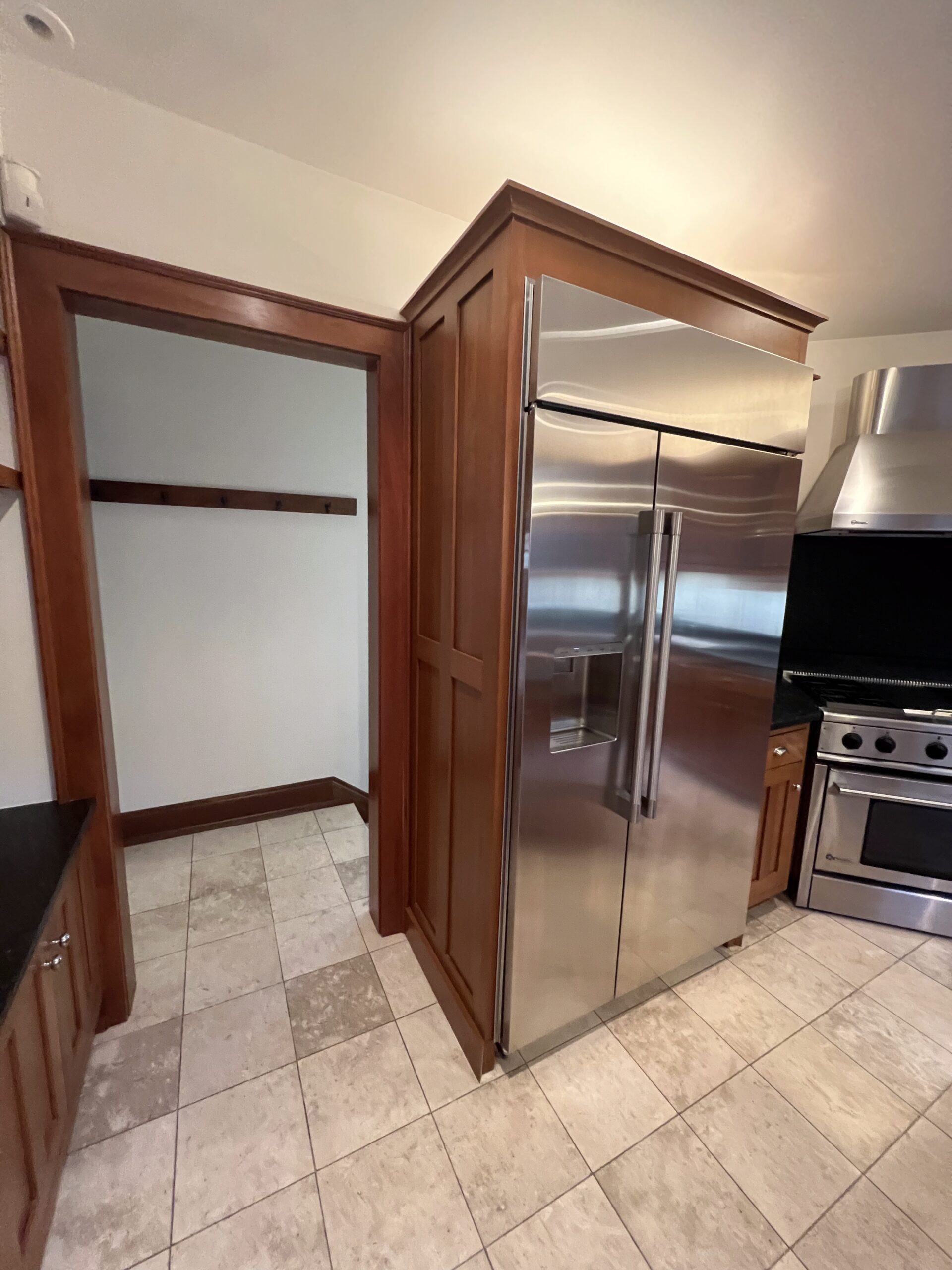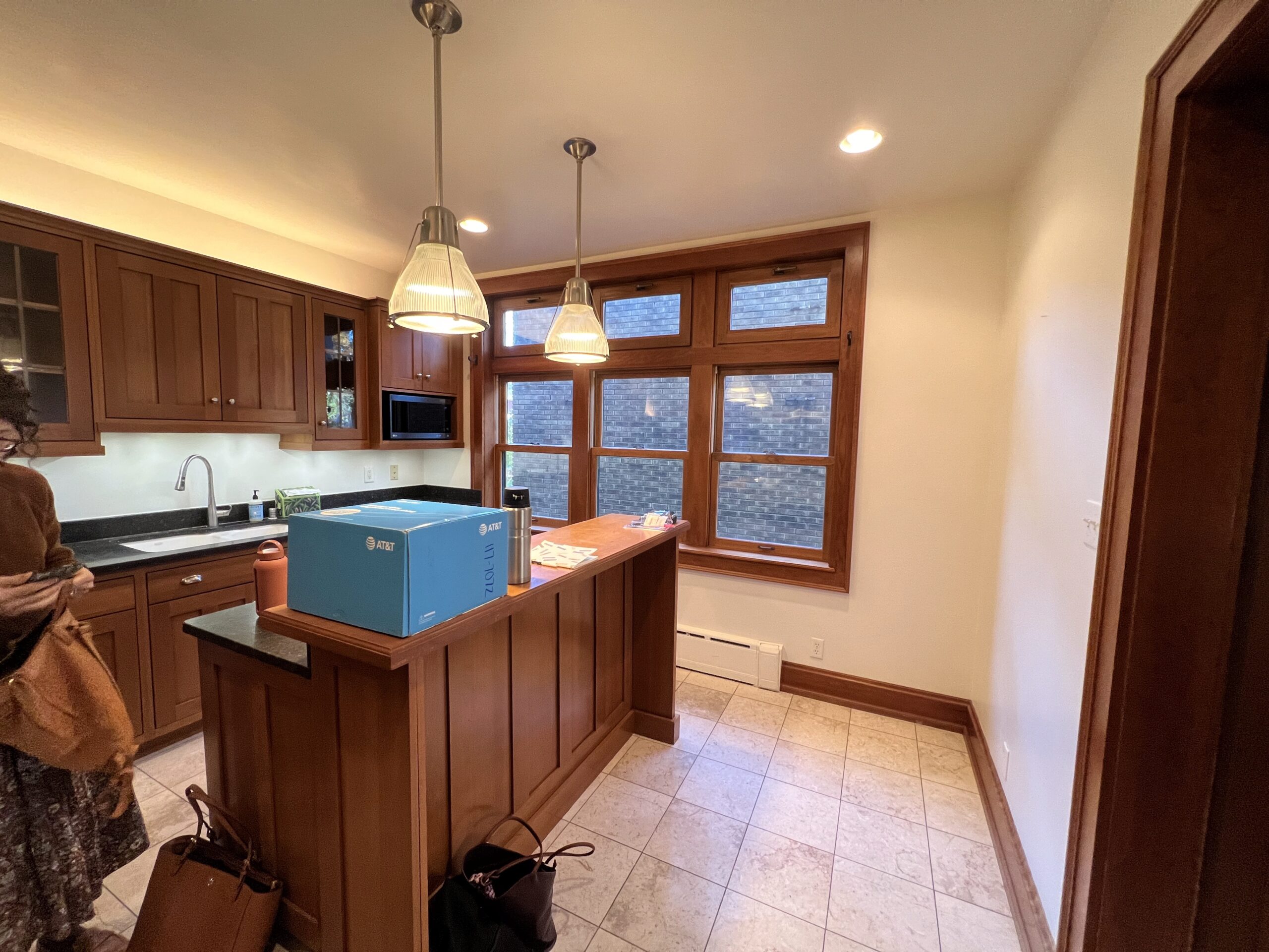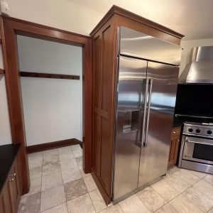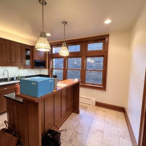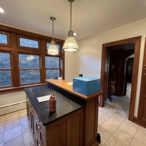 The new tile backsplash, laid in a clean, traditional pattern, brightens the space and complements the cabinetry without overpowering it. Underfoot, a herringbone tile floor introduces texture and visual movement while referencing historic flooring patterns often found in older Milwaukee homes. Crisp, light-colored countertops balance the cabinetry and provide a durable, modern work surface suited for daily use.