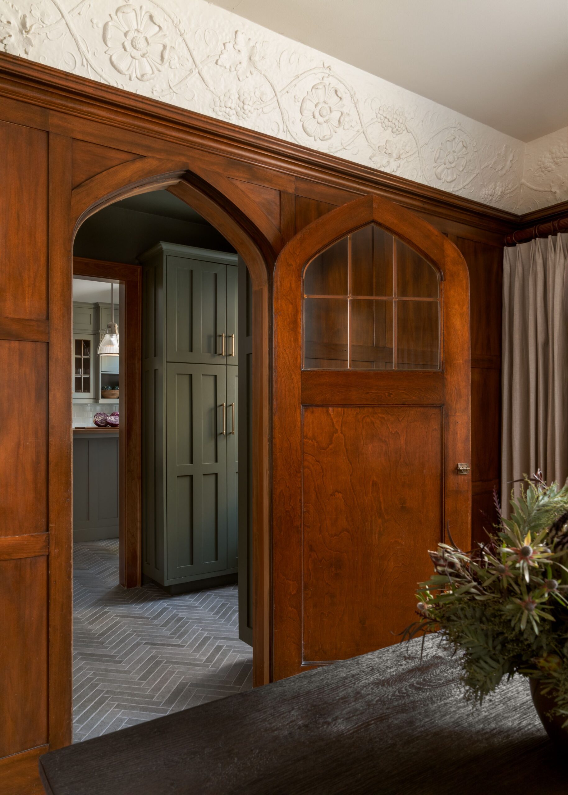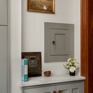showcasing everyday ceramics, echoing the feel of early 20th-century built-ins. Warm brass hardware adds subtle contrast and patina, reinforcing the connection between old and new.
