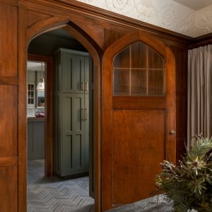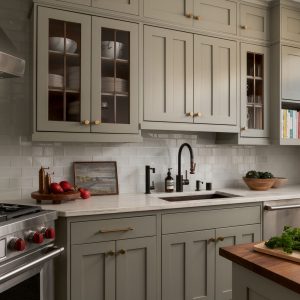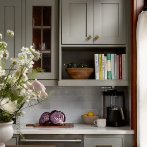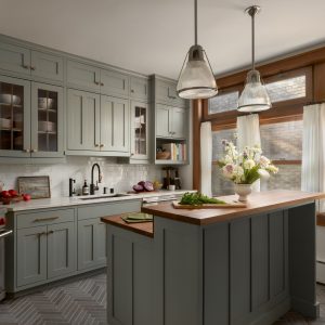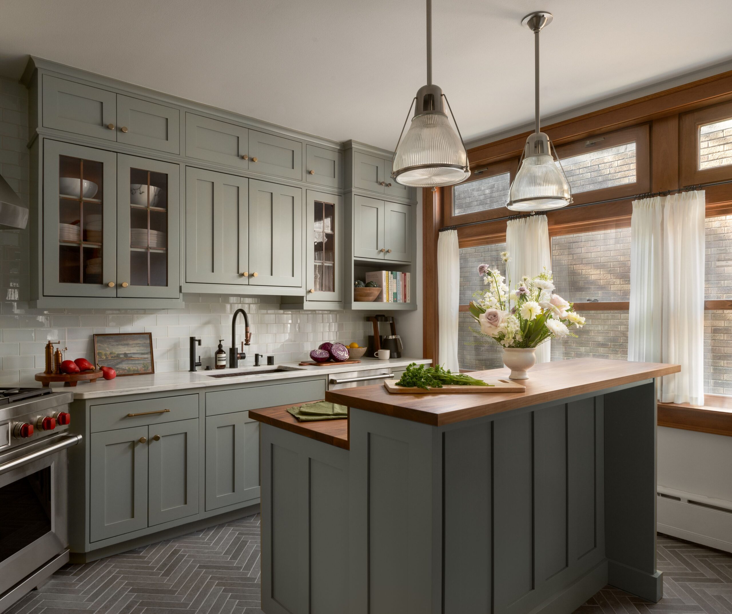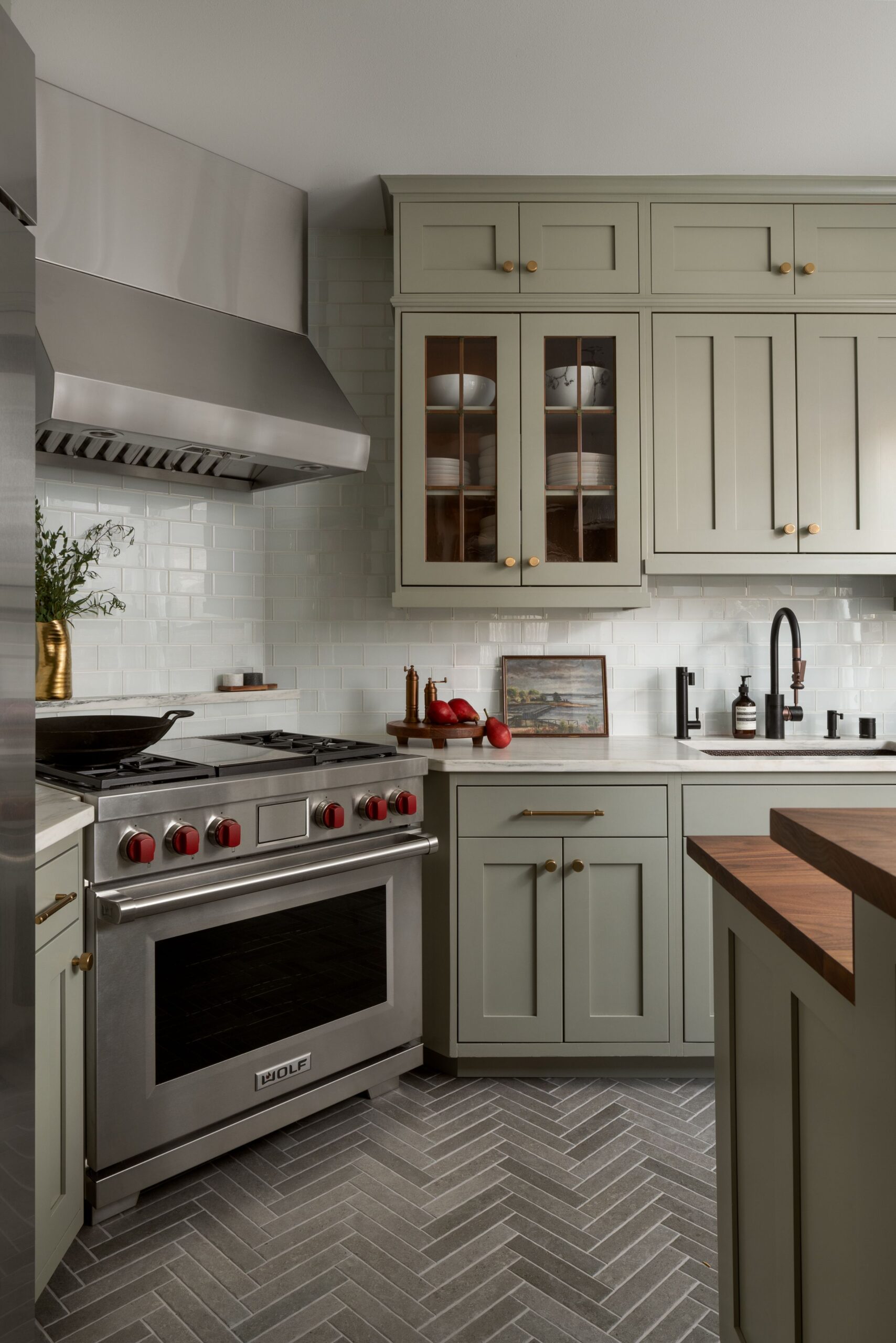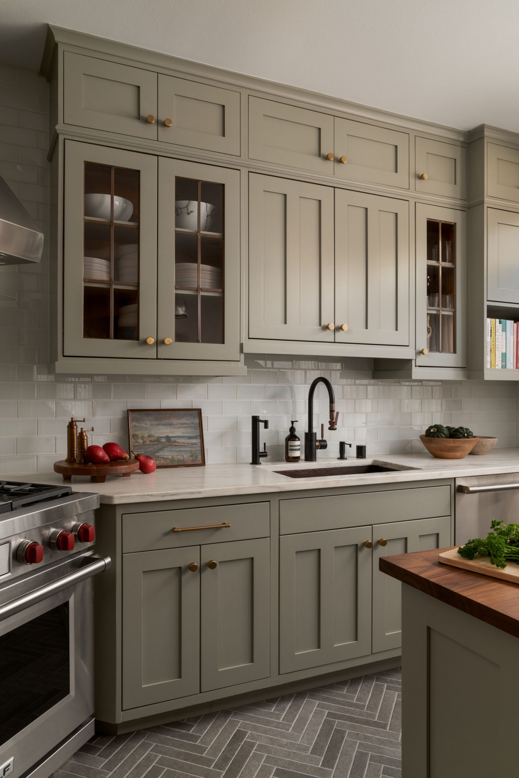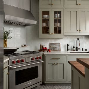 Custom cabinetry, painted in a soft, timeless green, anchors the kitchen and reflects traditional craftsmanship through classic door profiles, inset detailing, and carefully scaled proportions. Glass-front upper cabinets provide moments of openness while